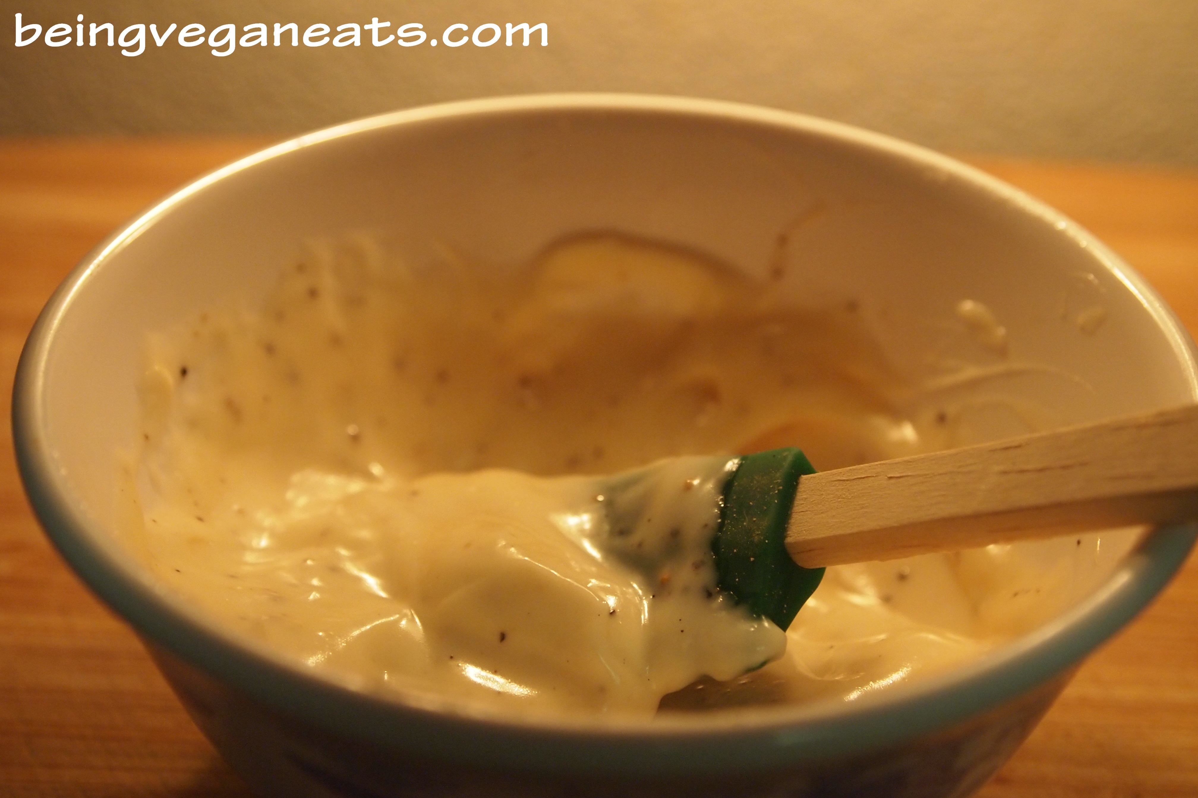 In a mixing bowl, combine the vegan mayo, sesame oil, mustard powder, and cracked pepper. Whisk or mix until combined.