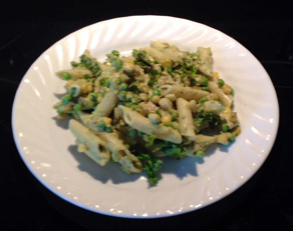 - Toss the pasta with the peas, corn, kale, broccoli and diced grilled chicken.