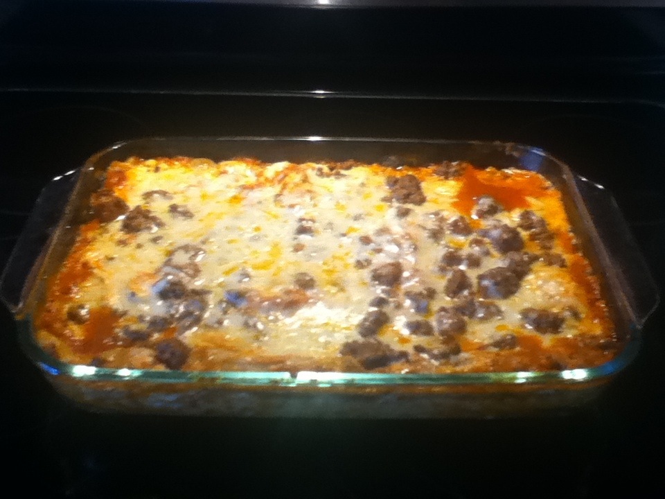 DRAIN meat; return to skillet. Stir in spaghetti sauce. Add 1 cup water to empty sauce jar; adding the water to the sauce helps cook the traditional noodles during baking, so you don’t have to cook them beforehand. This saves you 15 to 20 minutes of prep time. Add water to meat mixture; stir until blended. Spread 1 cup meat sauce onto bottom of 13×9-inch baking dish; top with layers of 3 lasagna noodles, 1/3 of the ricotta cheese mixture and 1 cup meat sauce. Repeat layers twice. Top with remaining noodles, meat sauce and cheeses. Cover with foil sprayed with cooking spray.