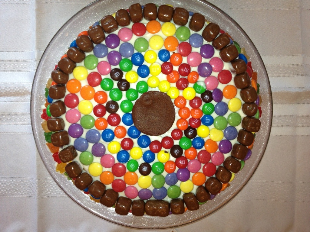 Place round cake on top and invert cake so the hollowed and candy filled cake is the top