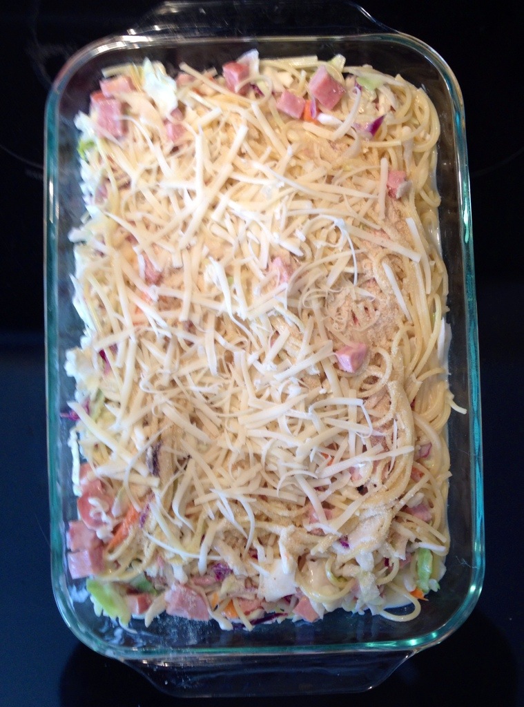 4. Stir spagetti, cabbage, and kolbassa sausage into the sauce and transfer to a 3-quart casserole dish. Mix bread crumbs with 1/4 cup swiss cheese in a bowl and sprinkle over the casserole.