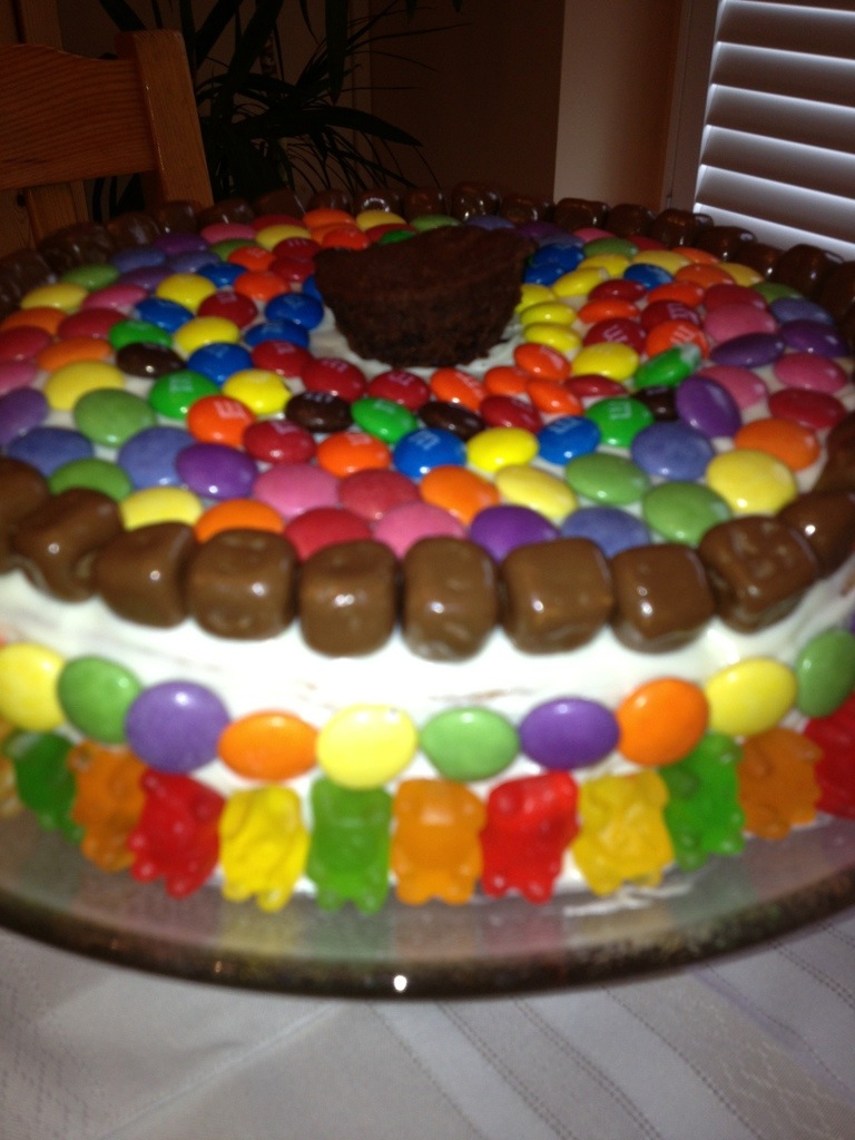 Place round cake on top and invert cake so the hollowed and candy filled cake is the top